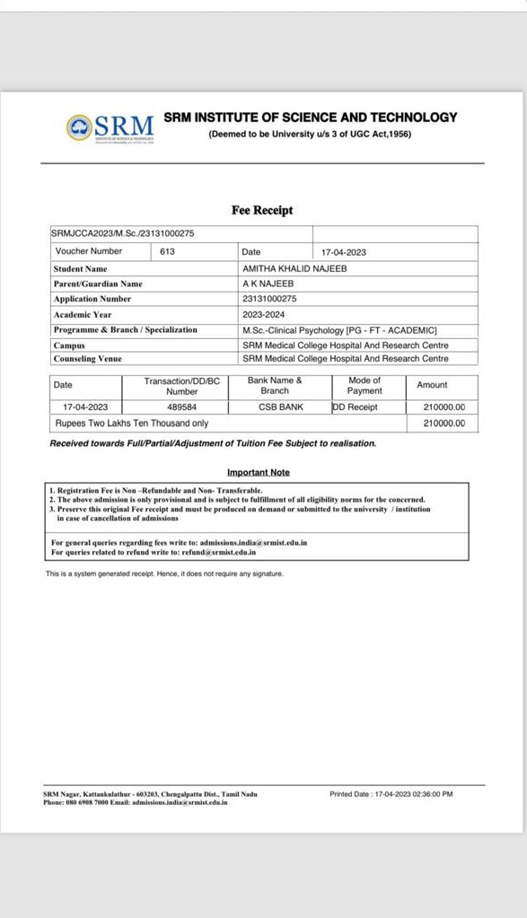 "Secured CSE with AI & ML specialization at SRM Kattankulathur through GL Consultancy. They explained the curriculum, dedicated AI labs with GPU servers, and placement statistics for this branch. The team clarified all fee structure details including ₹3.5L/year tuition and hostel costs. Got Block 1 accommodation close to Tech Park. Excellent guidance!"