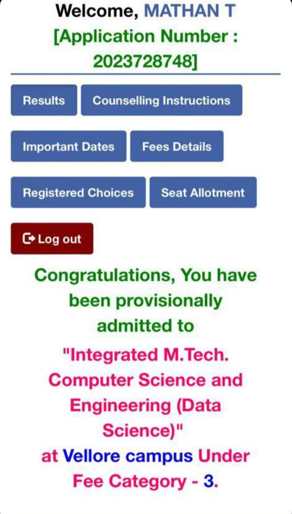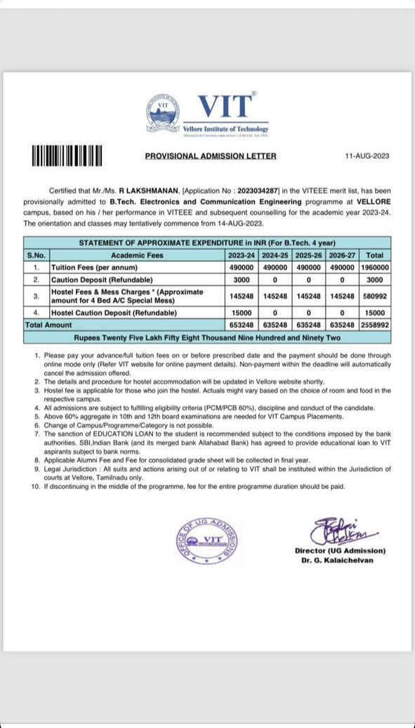 "After preparing for JEE, wrote VITEEE as backup. Scored 25,000 rank and was aiming for ECE at Vellore campus. GL Consultancy team explained the entire admission process, category-wise seat allotment, and fee structure (₹1.98L/year). They helped with document verification, slot booking, and even guided on hostel preferences. Got ECE at Vellore main campus! Very happy with their expert counseling."